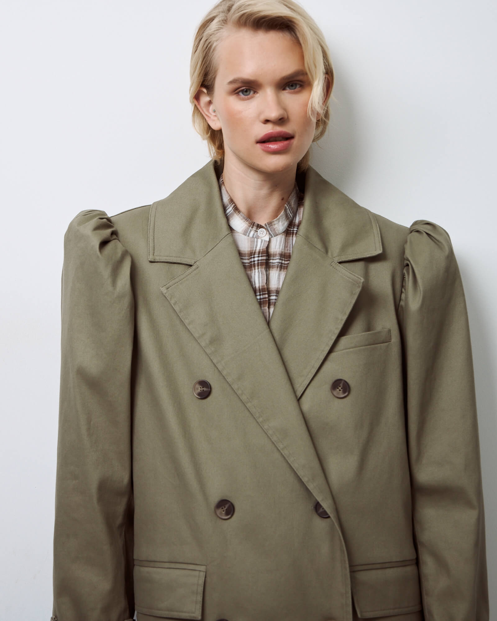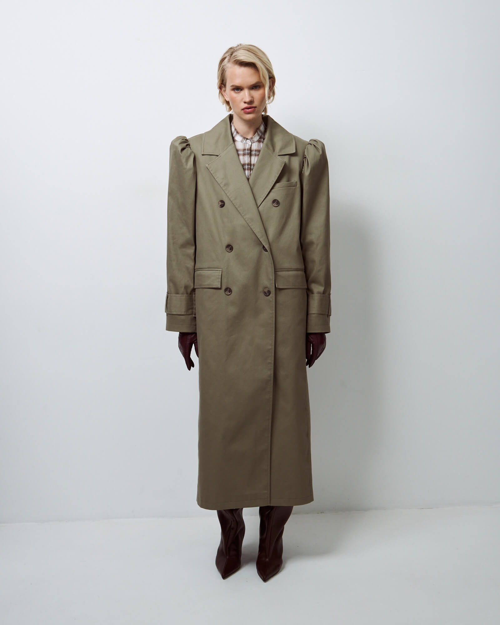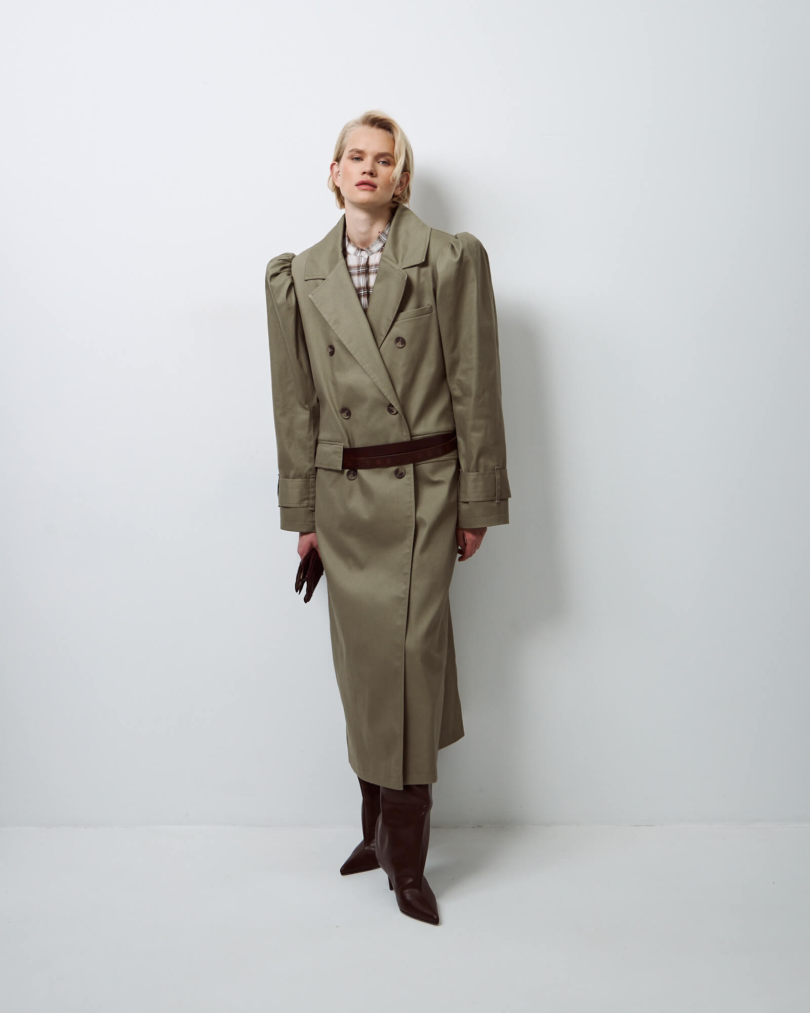 Тренч двубортный мужского кроя с английским воротником, декорирован нагрудным карманом